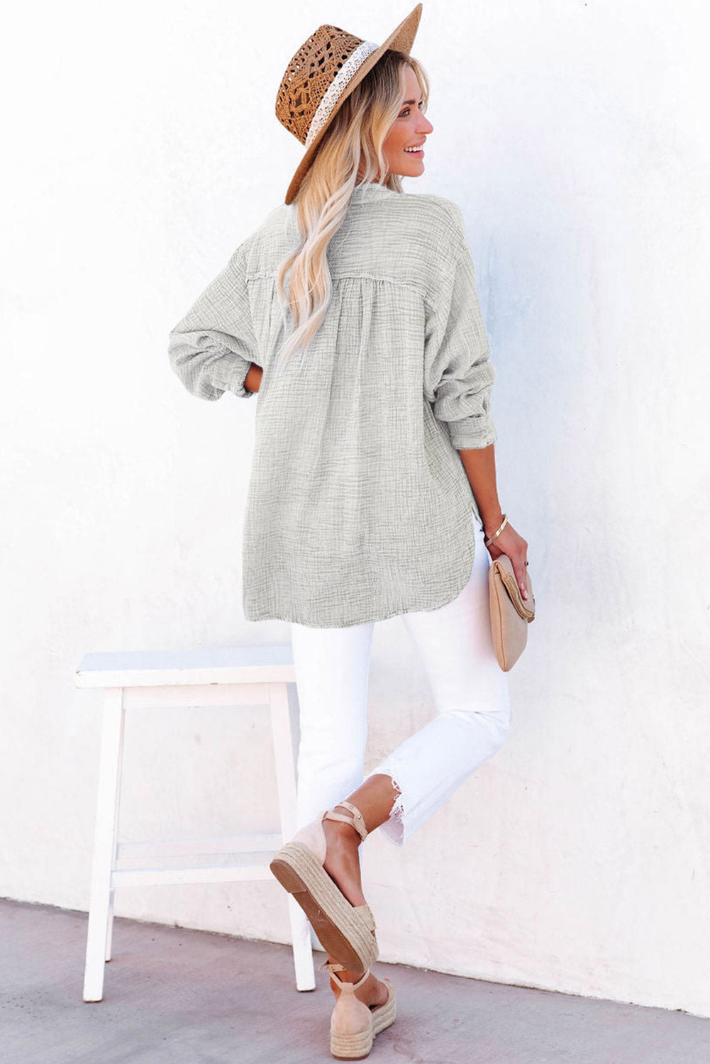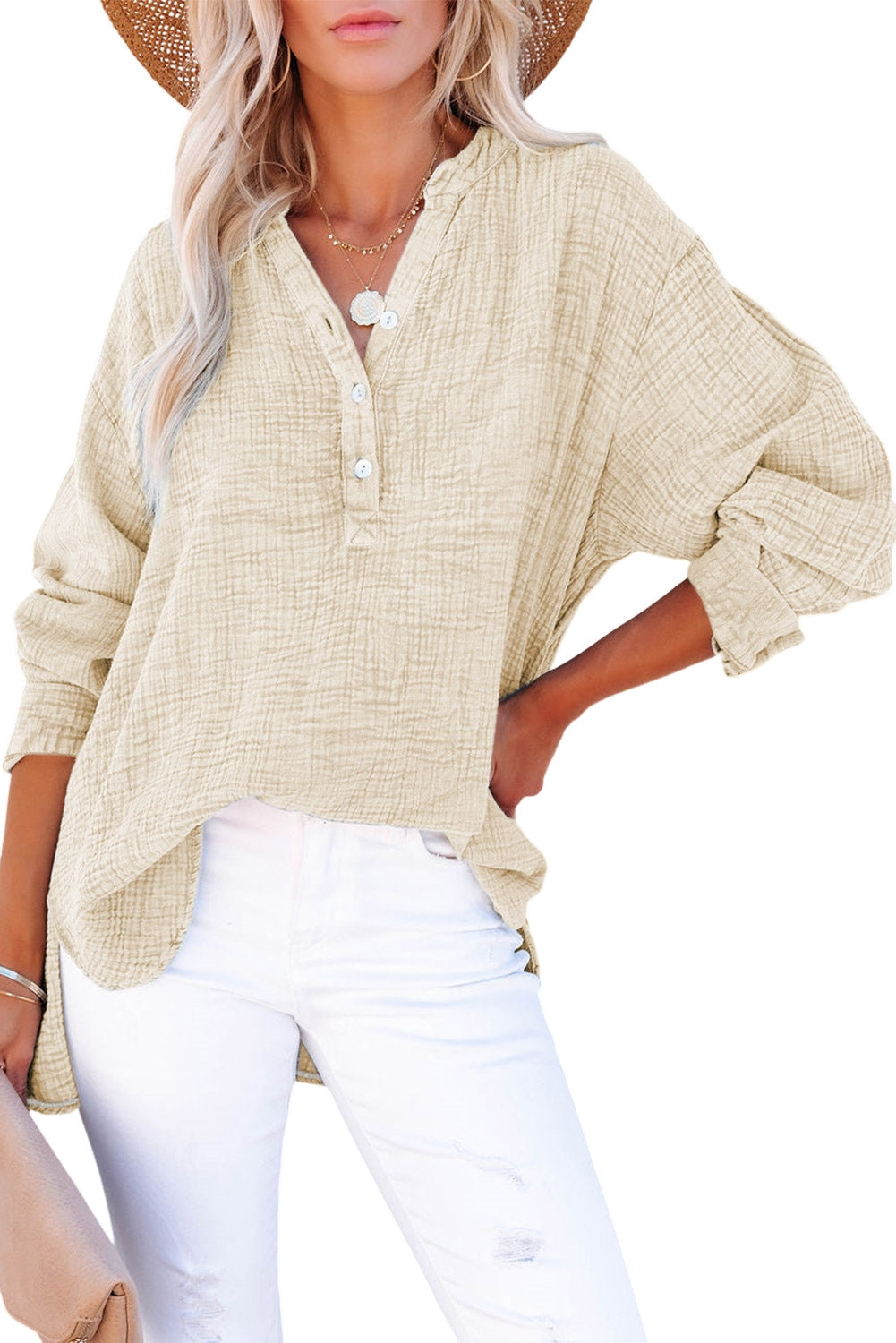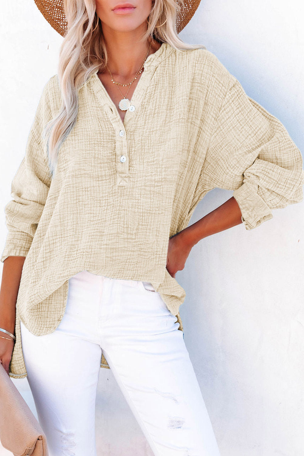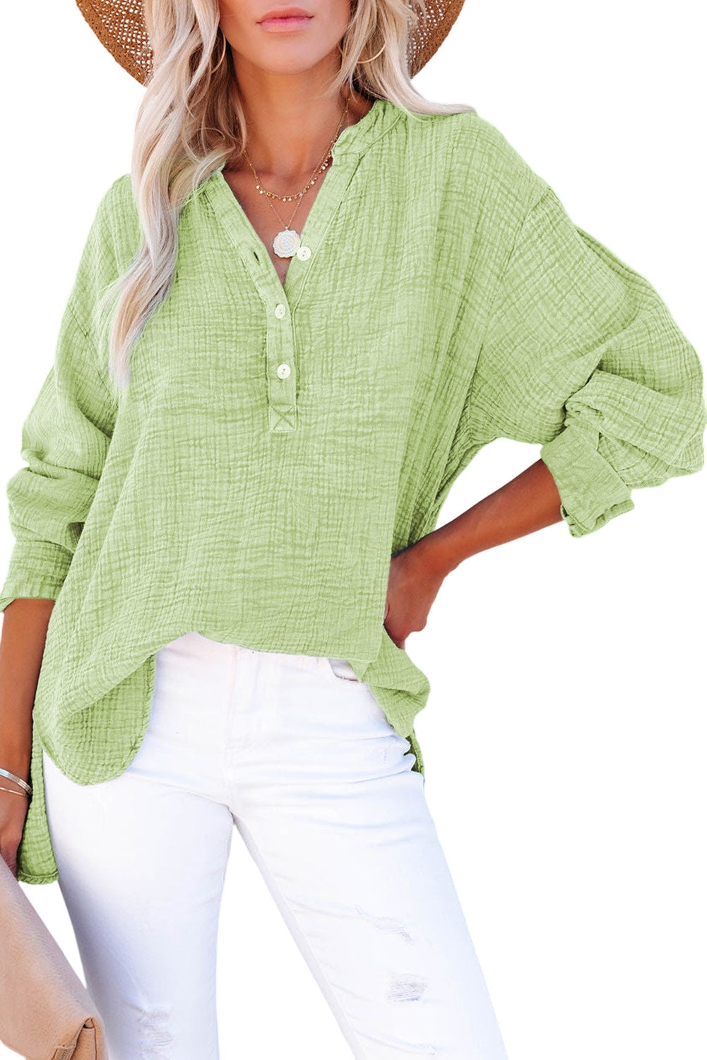 Women's Solid Crinkle Textured Loose Henley Top