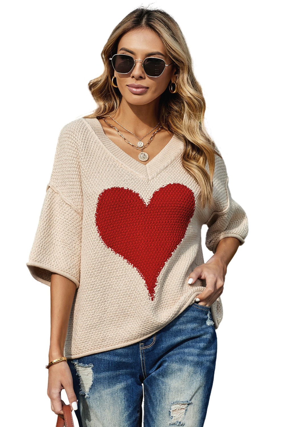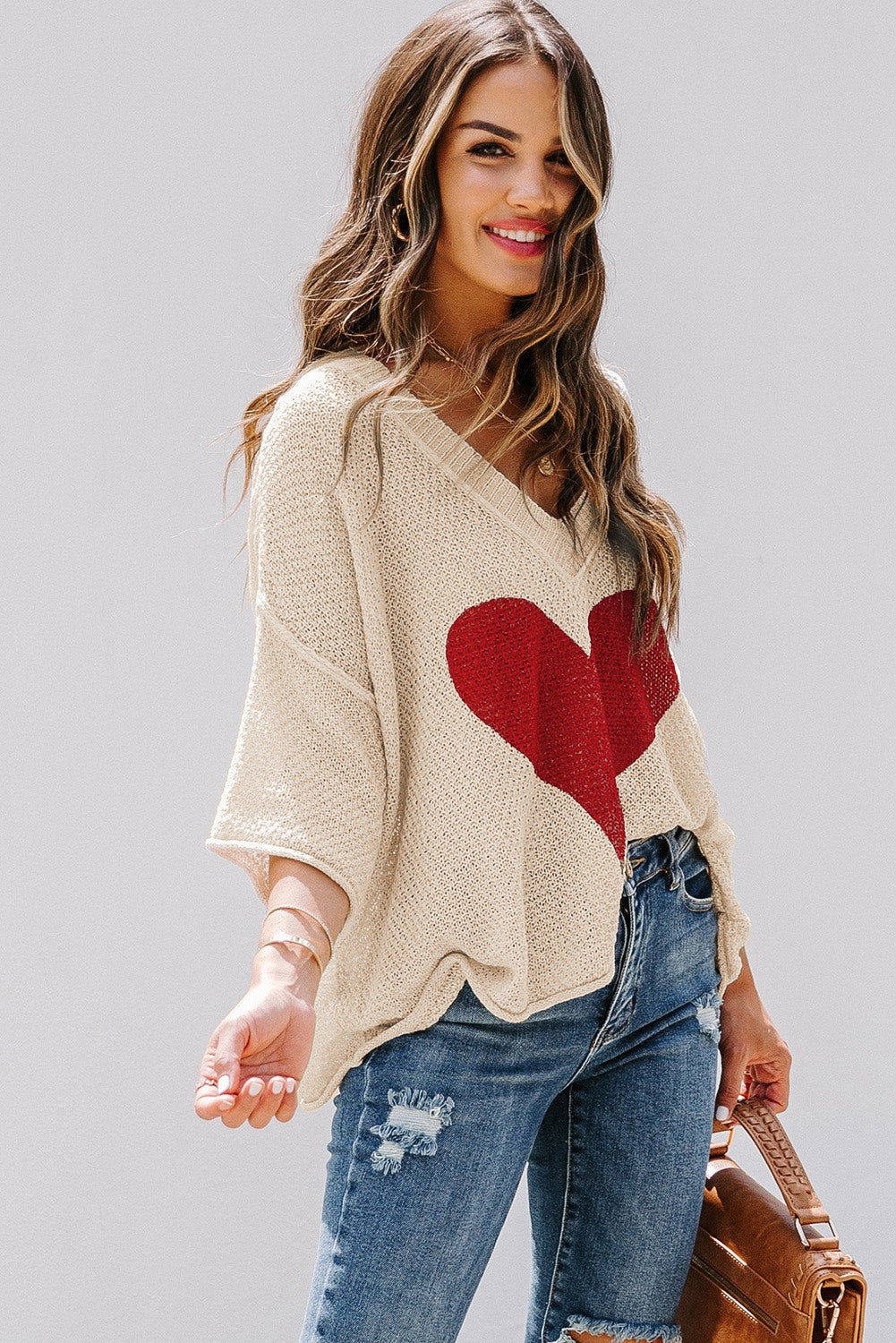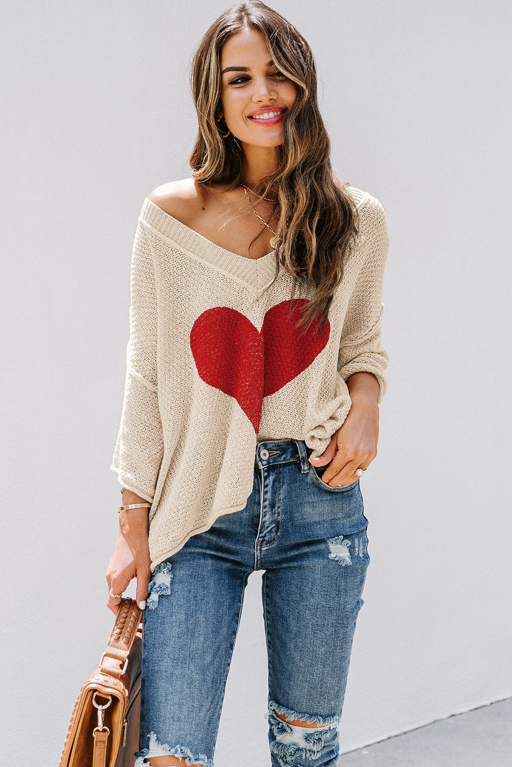 Valentine Day V Neck Oversized Knit Sweaters Heart Print Slouchy Top